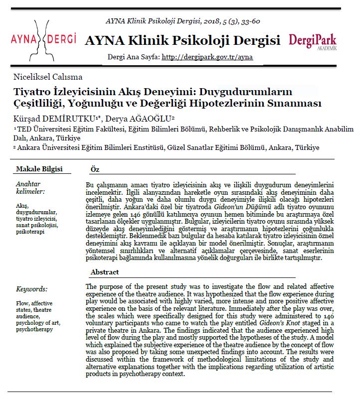 Our faculty member Dr. Kürşad Demirutku and Derya Ağaoğlu who was graduated from TED University Guidance and Psychological Counseling Department and now is a master student at Ankara University Faculty of Fine Arts wrote an article named “Flow Experience of the Theatre Audience: Testing the Affective Variety, Intensity, and Valence Hypotheses” and it is published in the Ayna Clinical Psychology Journal.
