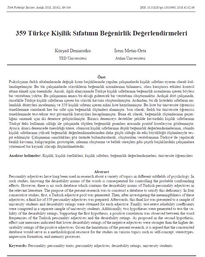 Öğretim Üyelerimizden Doktor Öğretim Üyesi Kürşad Demirutku'nun Atılım Üniversitesi'nden Öğretim Görevlisi İrem Metin Orta ile yazdığı "359 Türkçe Kişilik Sıfatının Beğenirlik Değerlendirmeleri" isimli makale Türk Psikoloji Yazıları adlı dergide yayımlanmıştır.