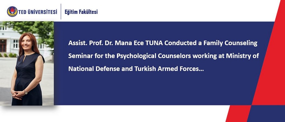 Fakültemiz Öğretim Üyelerinden Dr. Öğretim Üyesi Mana Ece Tuna, 10.09.2019'da Milli Savunma Bakanlığı ve Türk Silahlı Kuvvetleri bünyesinde çalışan psikolojik danışmanlara yönelik “Aile Danışmanlığı Eğitimi” konulu seminer vermiştir.
