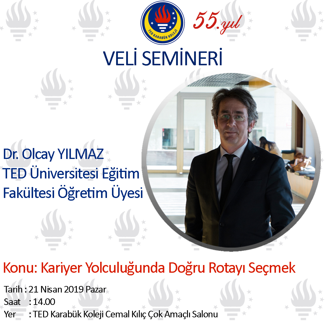 Eğitim Bilimleri Bölümü Rehberlik ve Psikolojik Danışmanlık ABD Öğretim Üyelerimizden Dr. Öğretim Üyesi Olcay Yılmaz 21 Nisan Pazar günü saat 14.00'da TED Karabük Kolej'nde "Kariyer Yolculuğunda Doğru Rotay Seçmek" başlıklı bir seminer verecektir.