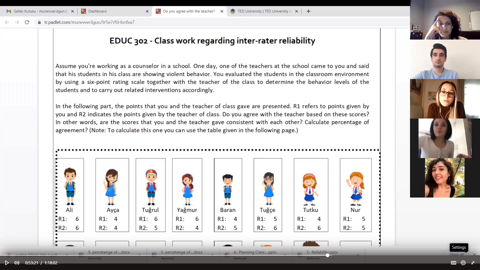 Dr. Öğr. Üyesi Münevver İLGÜN DİBEK tarafından verilen “Eğitimde Ölçme ve Değerlendirme (EDUC302/GPC303)” dersi kapsamında, güvenirliğin belirlenmesinde kullanılan puanlayıcılar arası güvenirlik yönteminin anlaşılması amacıyla öğrencilerin meslek hayatlarında karşılabilecekleri bir durum üzerinden senaryo verilmiştir. Böylelikle güvenirlik kavramı günlük hayatta beden bulmuştur.