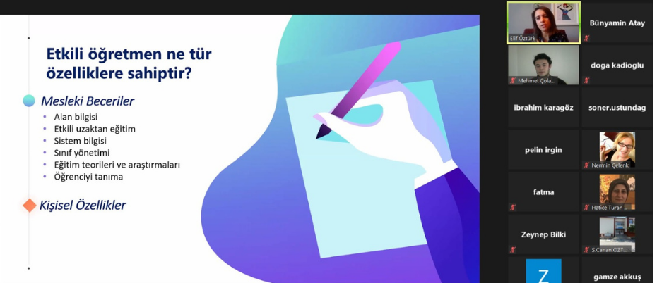 Within the framework of our university's community services, our faculty member Dr. Elif Öztürk’s seminar titled "Effective Teacher Skills" was held with 40 participants consisting of teachers and teacher candidates on 27 November 2020. In the seminar, the professional and personal skills required to be an effective teacher were discussed and experiences were shared. Thanks to all participants, a productive seminar was held by sharing various suggestions and practices on providing effective online teaching as well.