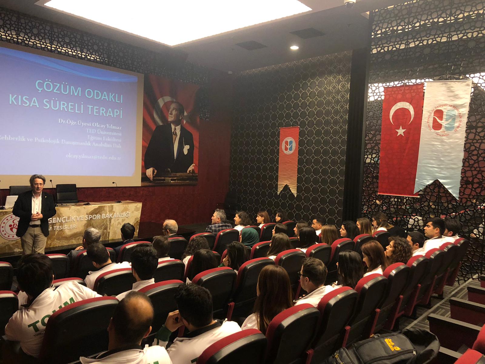 Dr. Olcay Yılmaz has condcuted a seminar on Short Term Solution Focused Therapy for Olympic Preparation Center (OPC) Sport Psychologists working at Ministry of Youth and Sports General Directorate. Addition to the Asistant Manager of Ministry of Youth and Sports General Directorate Mr. Murat Kocakaya's partipation, the Sport Psychologist from all over the country participated to the 9-hours-long education on February 7, 2020. Dr. Yılmaz shared his experience on theorethical and practical notions regarding the Short Term Solution Focused Therapy within the context of Sport Psychology.