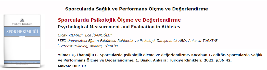 Our Faculty Member Dr. Olcay Yılmaz's book chapter entitled "Psychology Measurement and Evaluation in Athletes" ( with co-author Ece İbanoğlu) has been published on Turkish Clinics Sports Medicine's issue of “Health and Sport Evaluation in Athletes / Health and Performance Measurement and Evaluation in Athletes” on 8.10.2021.