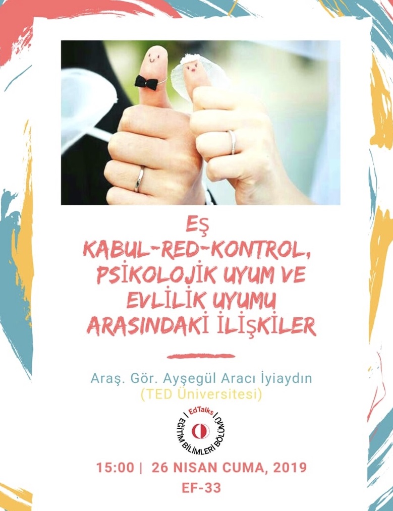 Research Assistant Ayşegül Aracı İyiaydın from Psychological Counseling and Guidance Program will give a seminar at METU Faculty of Education on April 29, 2019 at 15.00 p.m. The seminar is titled as "The Relationships among Partner Acceptance-Rejection, Partner Control, Psyhological Adjustment and Marital Adjustment".