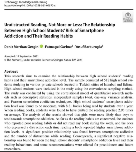The article “Undistracted Reading, Not More or Less: The Relationship Between High School Students’ Risk of Smartphone Addiction and Their Reading Habits” by TEDU GPC’s Research Assistant Yusuf Barburoğlu and faculty members of Trakya University Assoc. Prof. Dr. Deniz Mertkan Gezgin and Research Assistant Fatmagül Gürbüz has been published in “Technology, Knowledge and Learning”, an ESCI and ERIC indexed journal on October 8th, 2021.