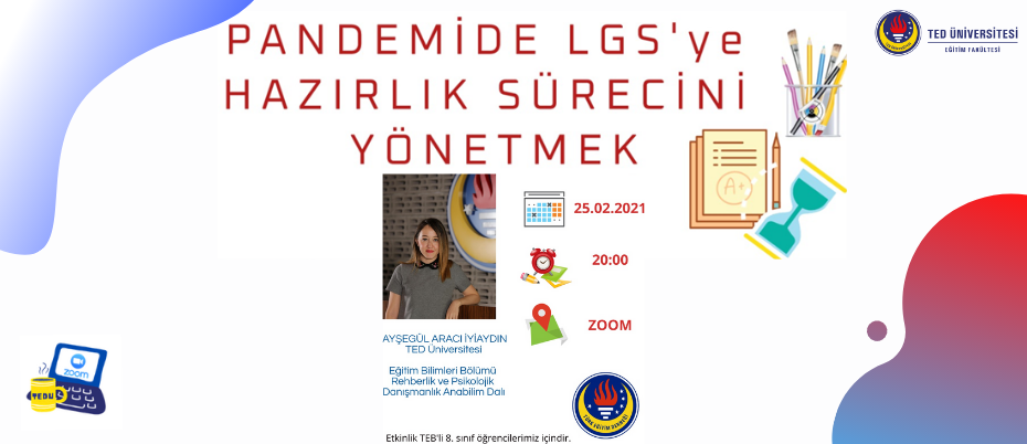 TEDÜ PDR Araştırma Görevlilerinden Ayşegül Aracı İyiaydın, 25 Şubat Perşembe günü Türkiye geneli TED tam burslu 8. sınıf öğrencilerine yönelik “Pandemide LGS’ye Hazırlık Sürecini Yönetmek” başlıklı bir seminer verecektir.