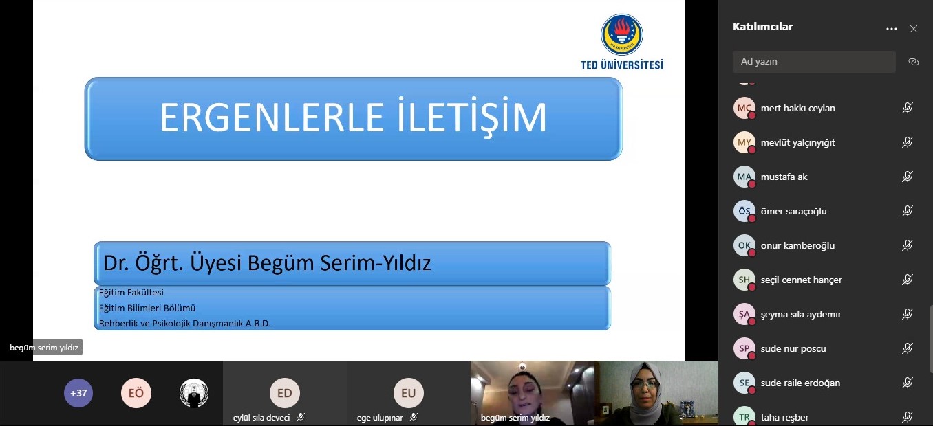 TEDÜ PDR ABD Dr. Öğr. Üyesi Begüm Serim-Yıldız, 18 Aralık 2020 tarihinde Gölbaşı Anadolu Lisesi öğrencilerinin ailelerine yönelik "Ergenlik Dönemindeki Çocukla İletişim" adlı online seminer gerçekleştirdi. Dr. Serim-Yıldız gelişim dönemi ve iletişim beceri ile ilgili bilgilerin yanı sıra ailelerden gelen soruları yanıtladı.