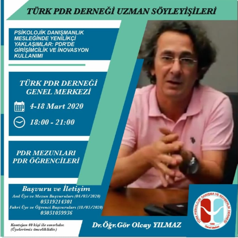 Dr. Öğr.Üyesi Olcay YILMAZ "Psikolojik Danışmanlık mesleğinde yenilikçi yaklaşımlar:PDR'de girişimcilik ve inovasyon kullanımı" konusunda 4 ve 18 Mart 2020 tarihlerinde Türk PDR Derneği Uzman Söyleşilerinin konuğuydu.