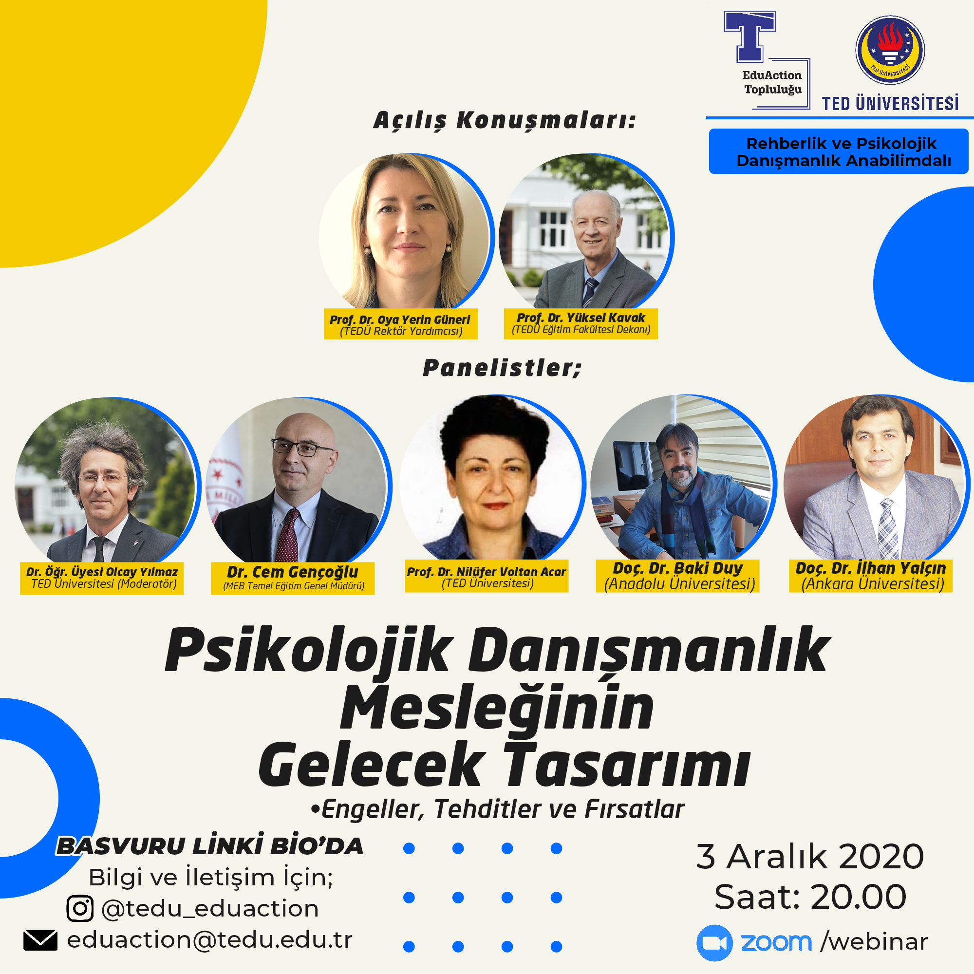 EduAction Öğrenci Topluluğu ve Rehberlik ve Psikolojik Danışmanlık Anabilim Dalı işbirliğinde düzenlediğimiz 3 Aralık 2020 Perşembe günü saat 20.00’da gerçekleşecek olan “Psikolojik Danışmanlık Mesleğinin Gelecek Tasarımı: Engeller, Tehditler ve Fırsatlar” başlıklı çevrimiçi panele davetlisiniz.